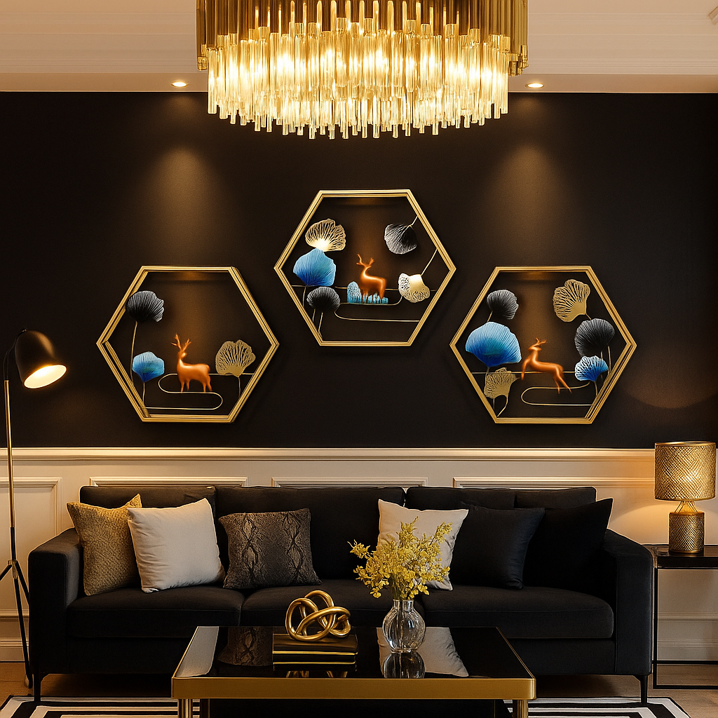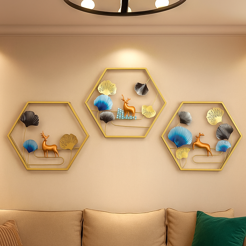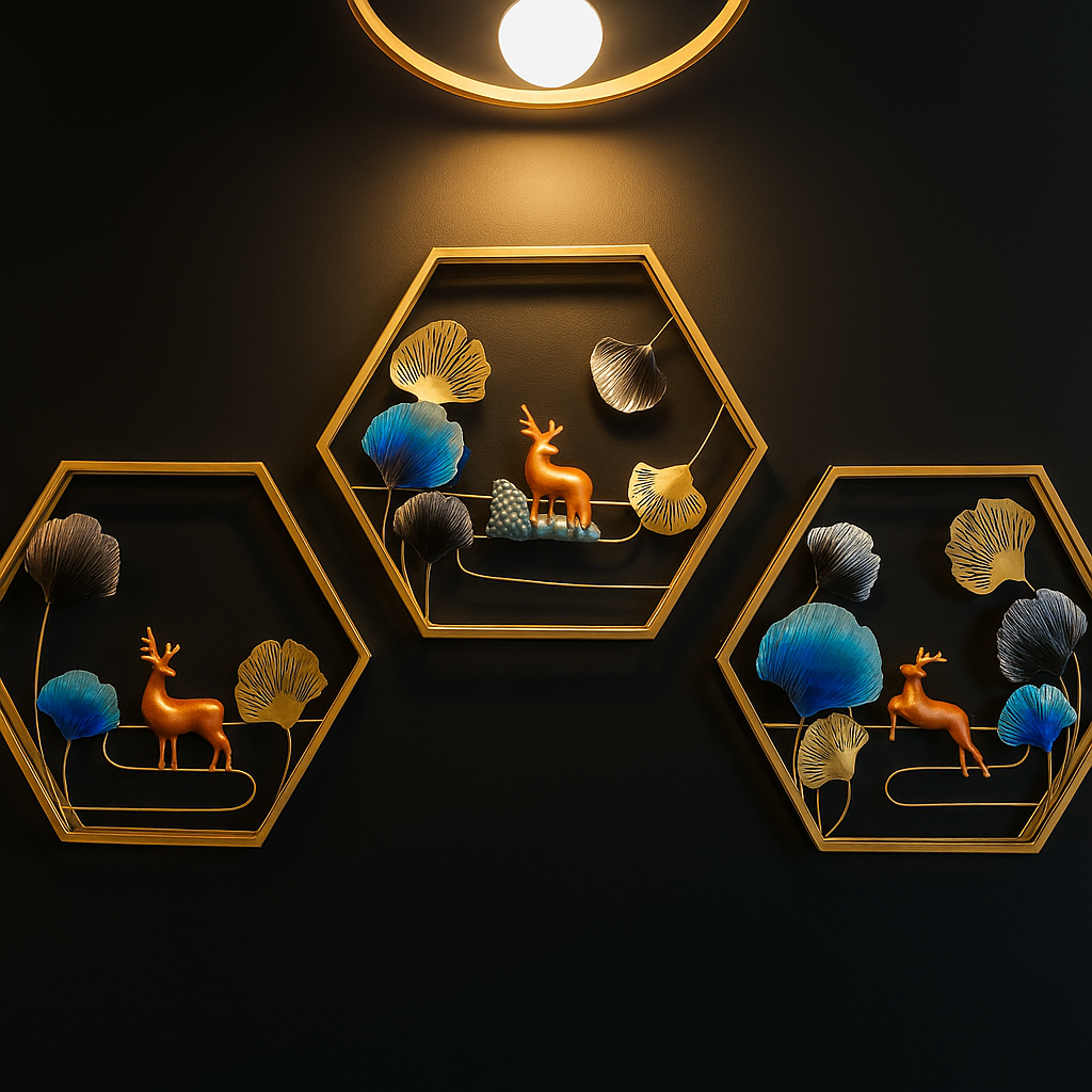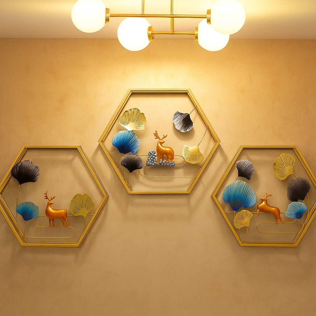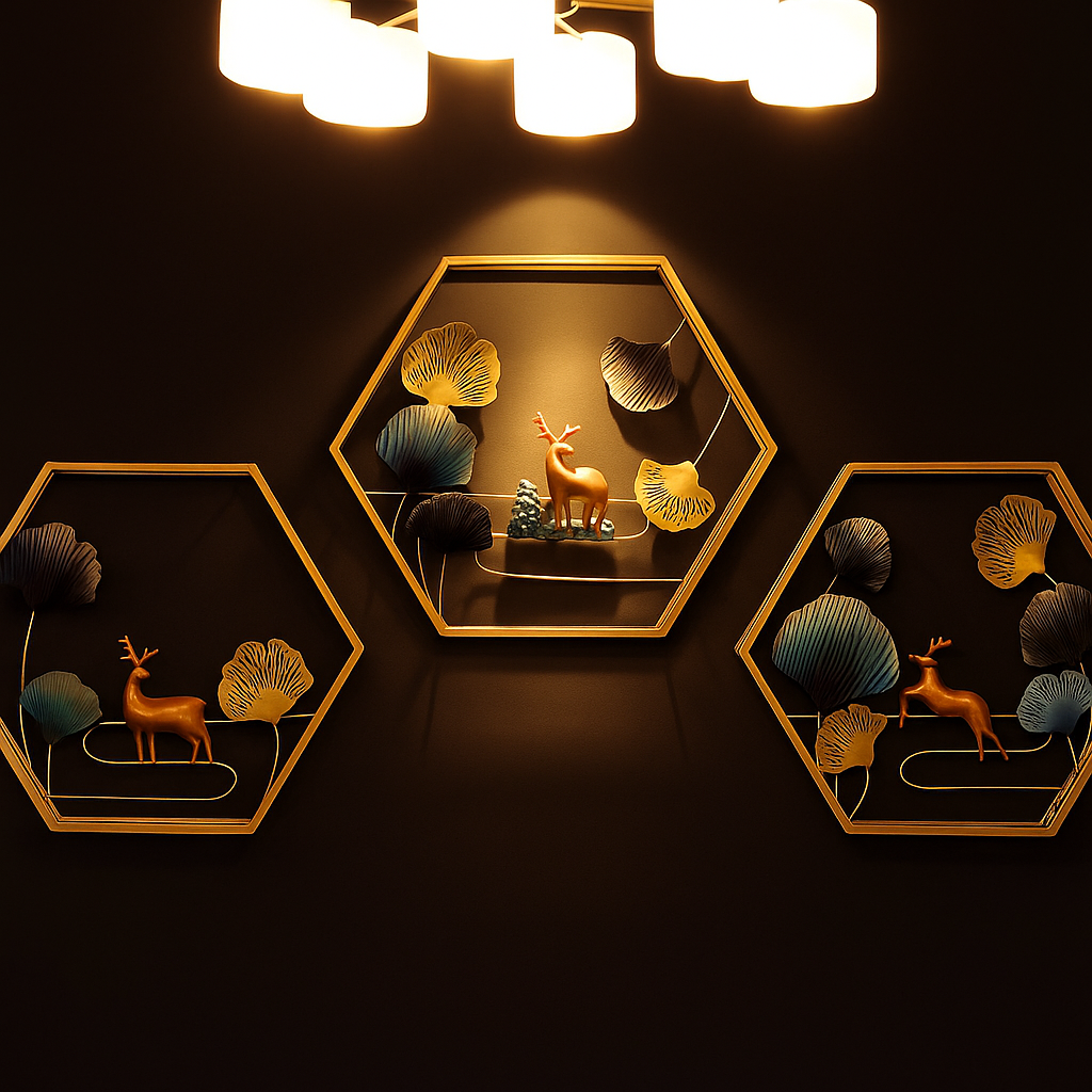 Perfect for living rooms, bedrooms, hallways, offices, dining areas, and boutique interiors, this designer wall décor trio adds both sophistication and warmth. The hexagonal symmetry combined with deer motifs represents balance, strength, and elegance, making it an ideal piece for both contemporary and classic interiors.