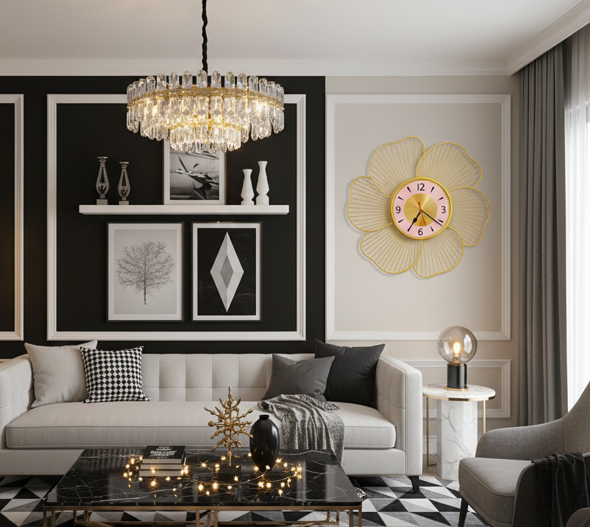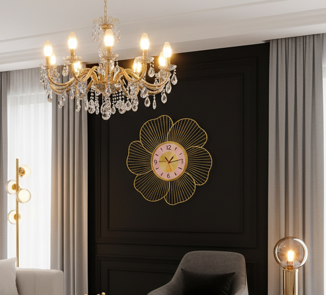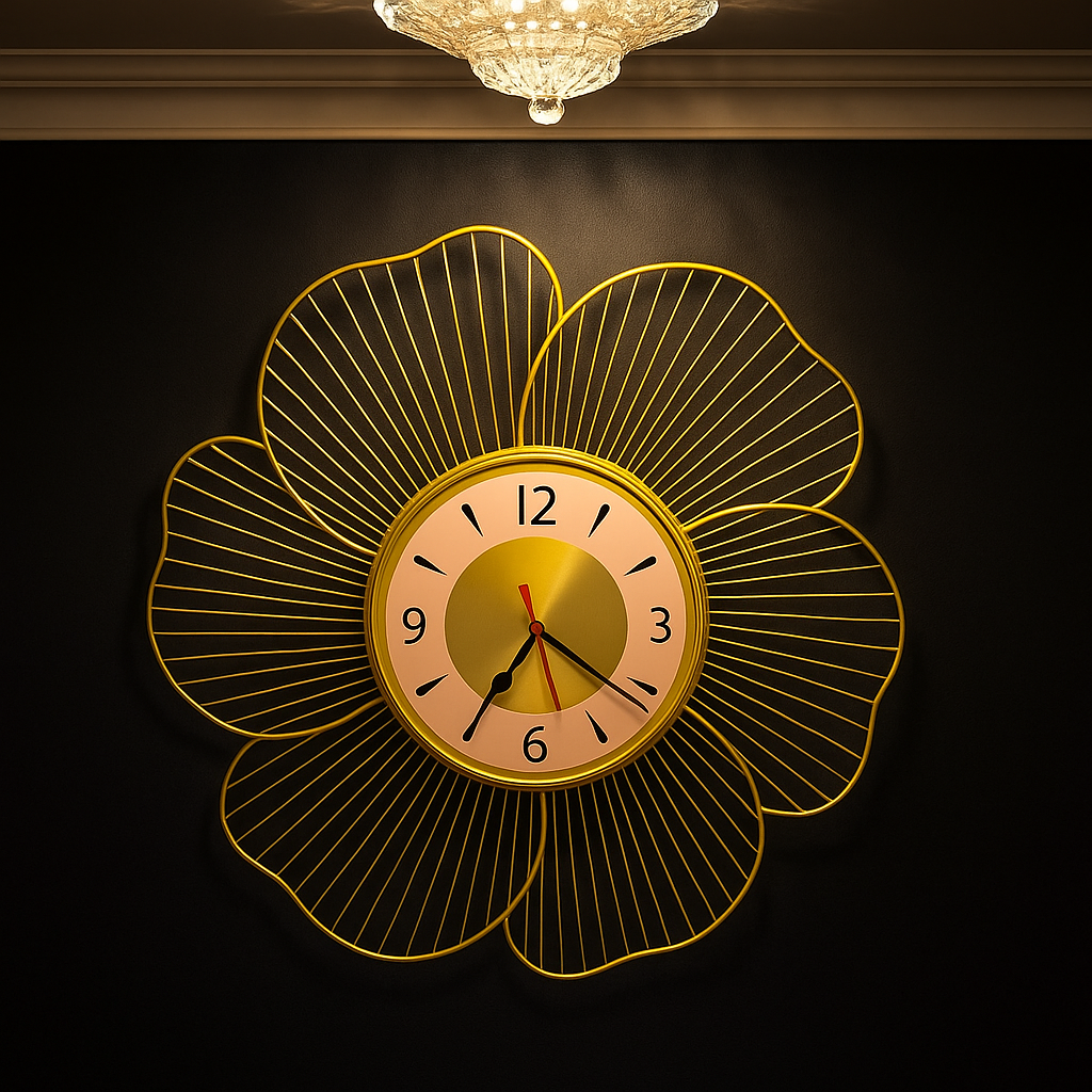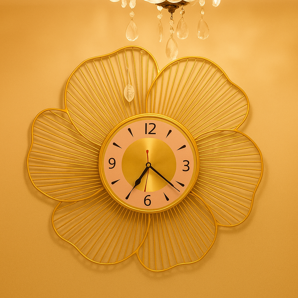 Add a touch of timeless elegance and modern charm to your home with the Golden Petal Floral Metal Wall Clock. This stunning piece features an intricate floral design crafted from premium golden metal petals that gracefully surround a beautiful blush pink clock face. The bold black numerals and sleek hands ensure easy readability, making it as functional as it is fashionable.